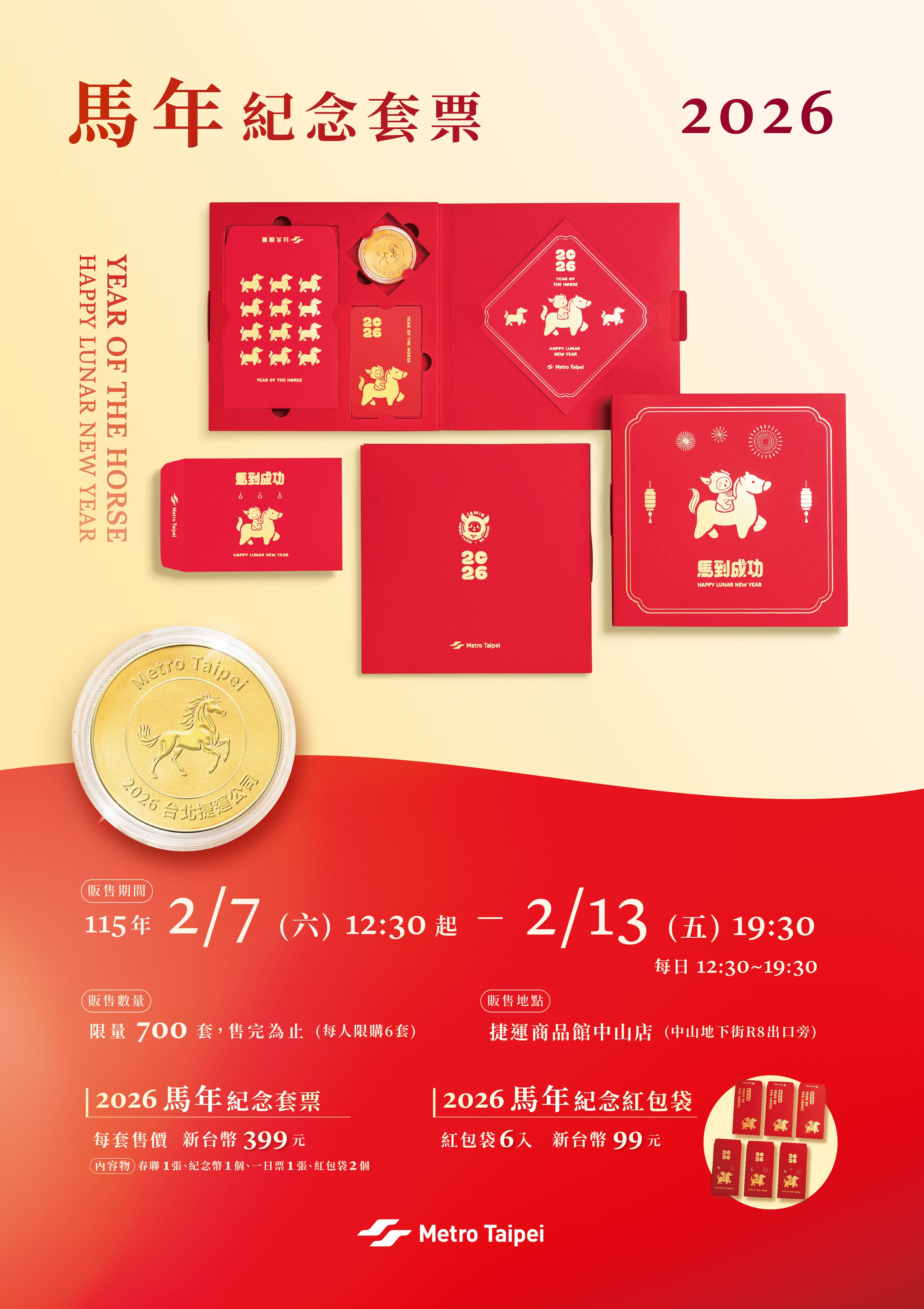 2026「馬年紀念套票」,內容為馬年紀念幣1枚、臺北捷運一日票1張、兩款特製紅包袋及春聯斗方1張,每套售價399元,限量700套,每人限購6套。今年首次推出「馬年紀念紅包袋組」,每組6入售價99元,以兩款造型傳遞「好運加倍」祝福,限量500組,每人限購6組。
