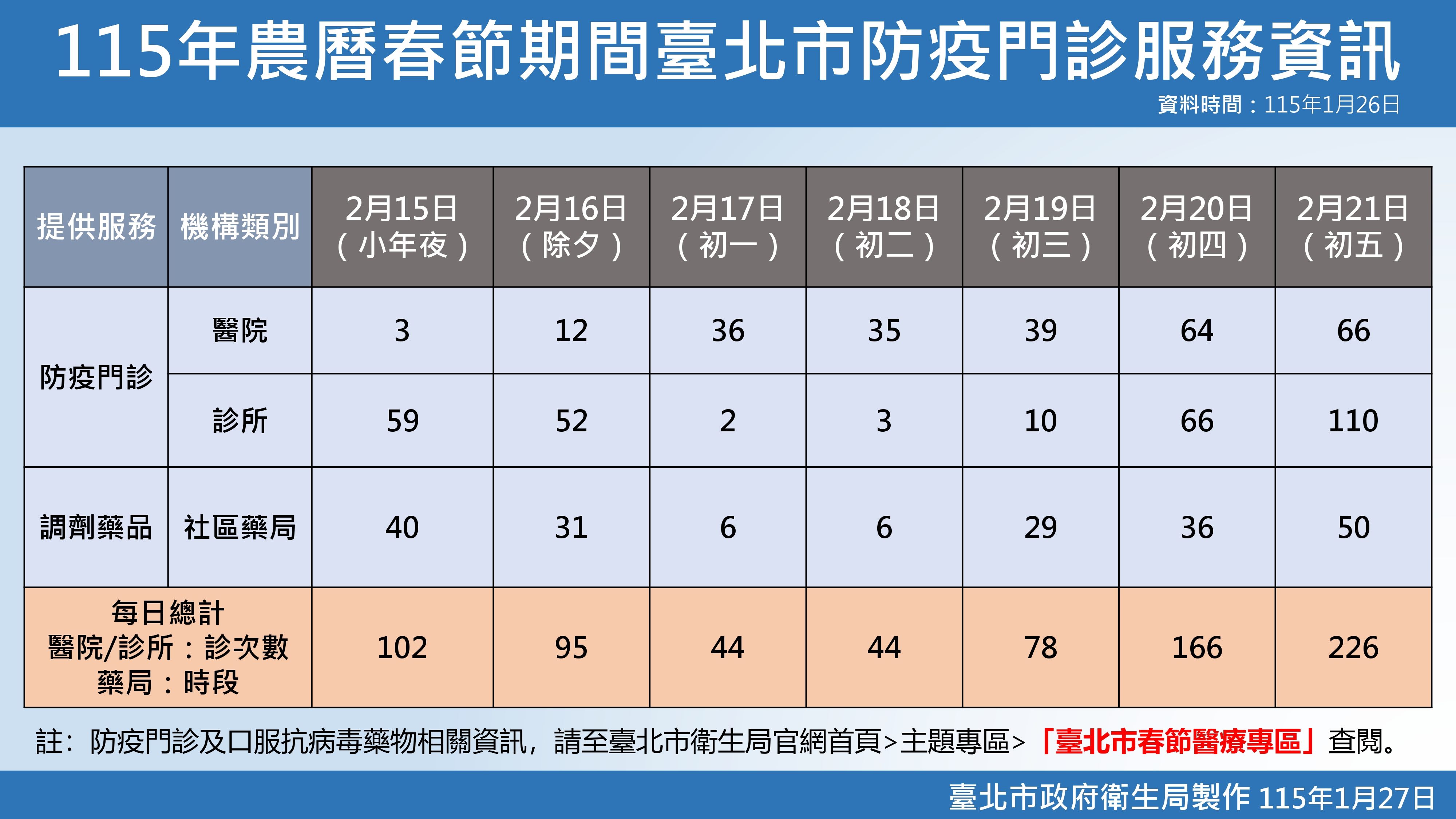 因應農曆春節連假期間仍為流感及COVID-19等呼吸道傳染病流行期,為避免呼吸道疾病患者均至大醫院就醫造成急診壅塞,增加交叉感染之風險,臺北市15家急救責任醫院及69家診所自小年夜至大年初五(2月15日至2月21日)期間,分時段開設557診次防疫門診,提供公費流感及COVID-19抗病毒藥劑服務;另有22間社區藥局提供COVID-19口服抗病毒藥物及一般處方箋領藥服務,請民眾善加利用。