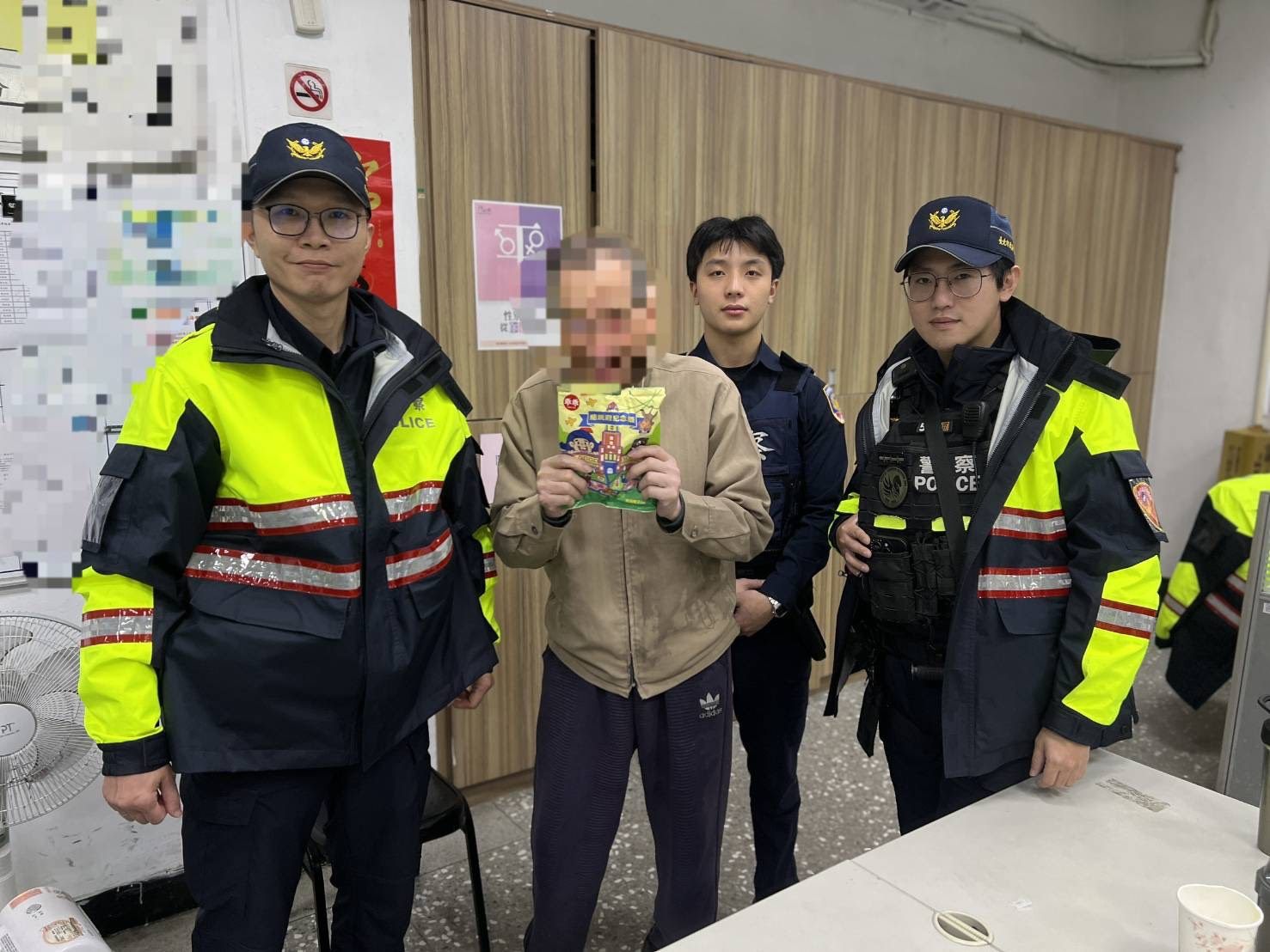 期間,為安撫長者情緒並緩解飢餓感,實習生吳冠廷靈機一動,拿出派出所珍藏的「總統府限定版乖乖」請老翁享用,老翁不僅吃得津津有味,還對這份特別的小點心讚不絕口,甚至在吃完後將包裝袋小心收起,準備帶回家留作紀念,畫面相當溫馨。