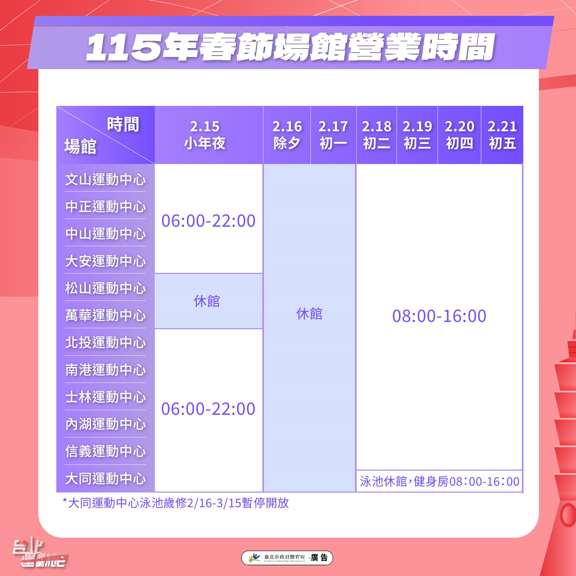 春節期間,萬華、松山運動中心配合歲修,自小年夜(2月15日)至初一(2月17日)閉館;其餘中正、信義、大安、中山、大同、文山、南港、內湖、士林、北投運動中心於小年夜早上6時至晚間10時開放,除夕及初一全天休館,初二至初五則自早上8時至下午4時營業;另大同運動中心游泳池自除夕(2月16日)起至3月15日進行年度整修,期間暫停開放,提醒民眾留意。各運動中心也於春節推出專屬優惠活動,包含門票折扣、體驗課優惠價與運動抽好禮等,相關內容可至各運動中心臉書粉絲專頁查詢。