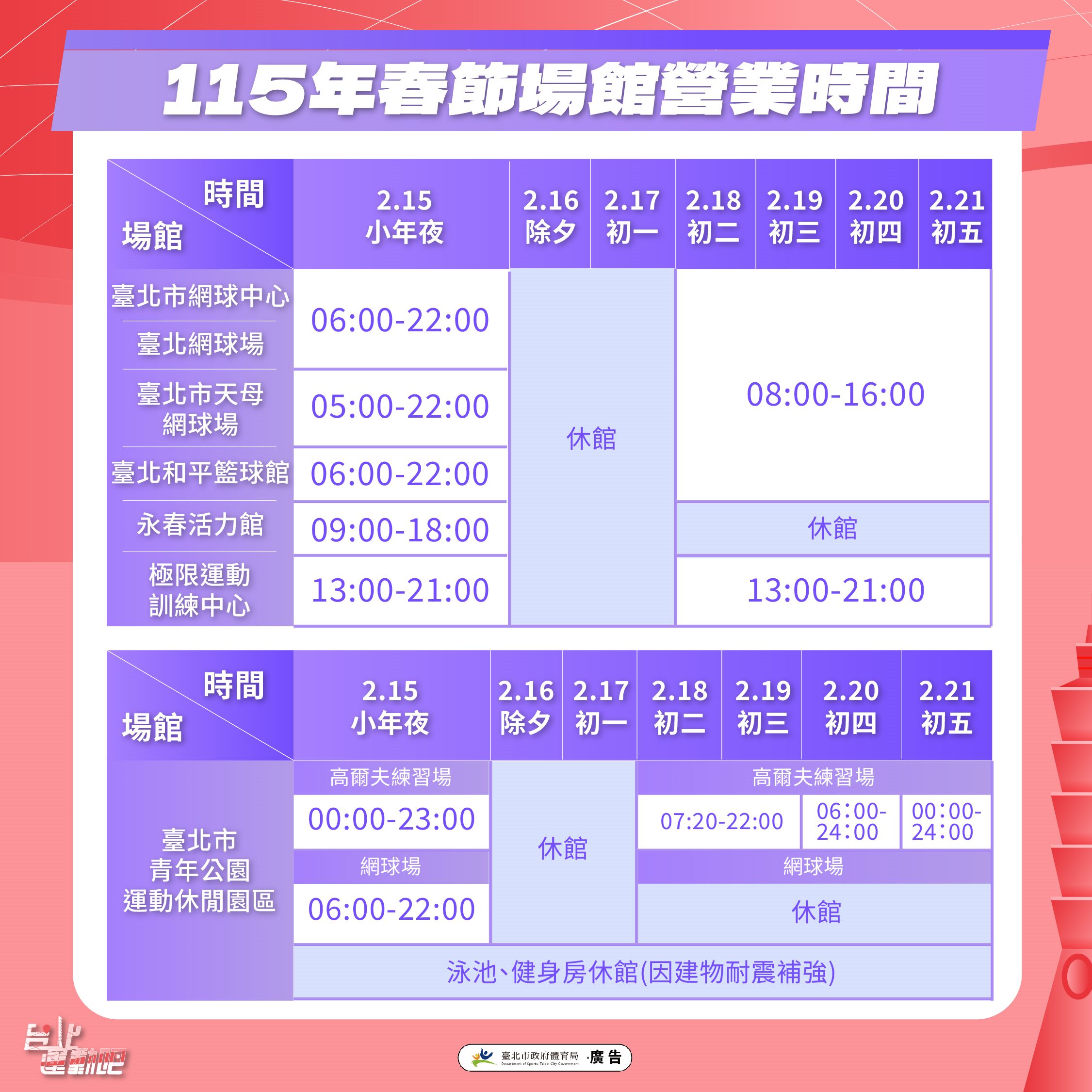 臺北體育館七樓羽球場、新生公園及青年公園棒球場於小年夜至初六期間暫停對外開放;各堤內及河濱公園開放式運動場地,春節期間照常開放,民眾可於現場輪流使用。各場館春節開放資訊詳見體育局網站(https://vbs.sports.taipei/news/?U=single&K=269)。