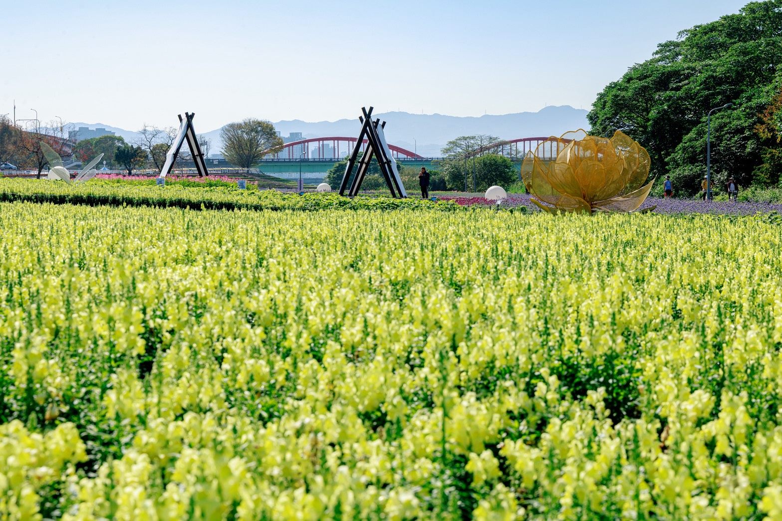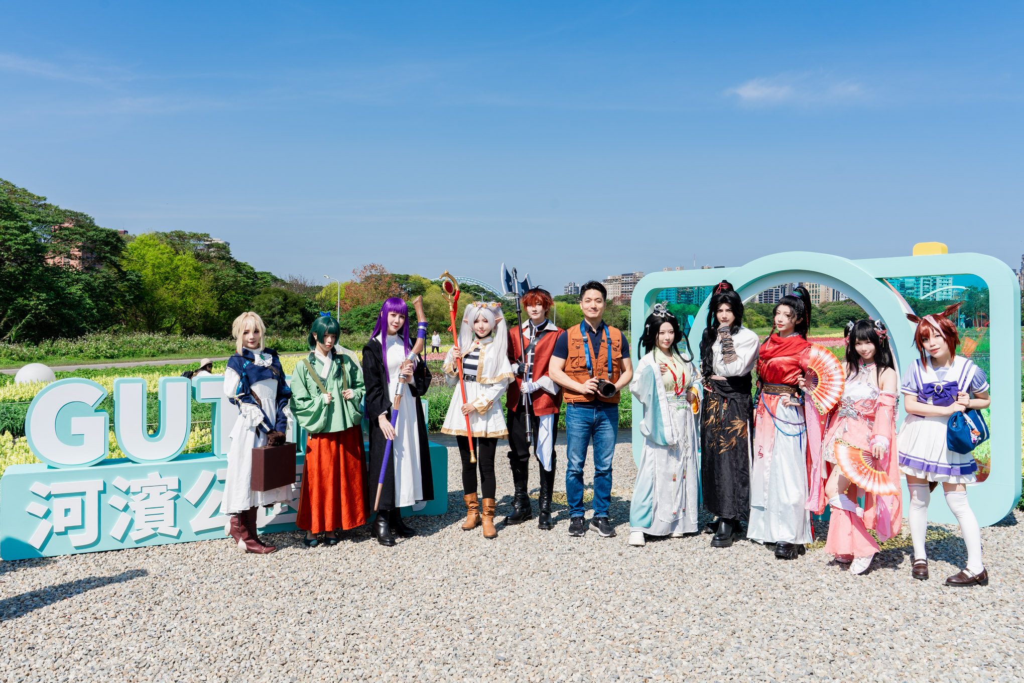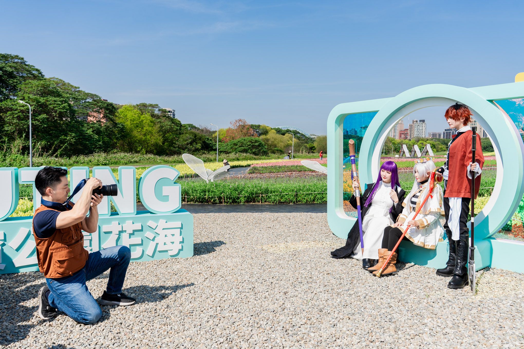 農曆年走春必訪花海景點就在台北市古亭河濱公園。臺北市政府水利工程處今(14)日上午於古亭河濱公園花海裝置景觀區,邀請國內高人氣Cosplayer——Chihiro千尋、Genko玄子、Tsun越尊等,與市長蔣萬安驚喜同框。