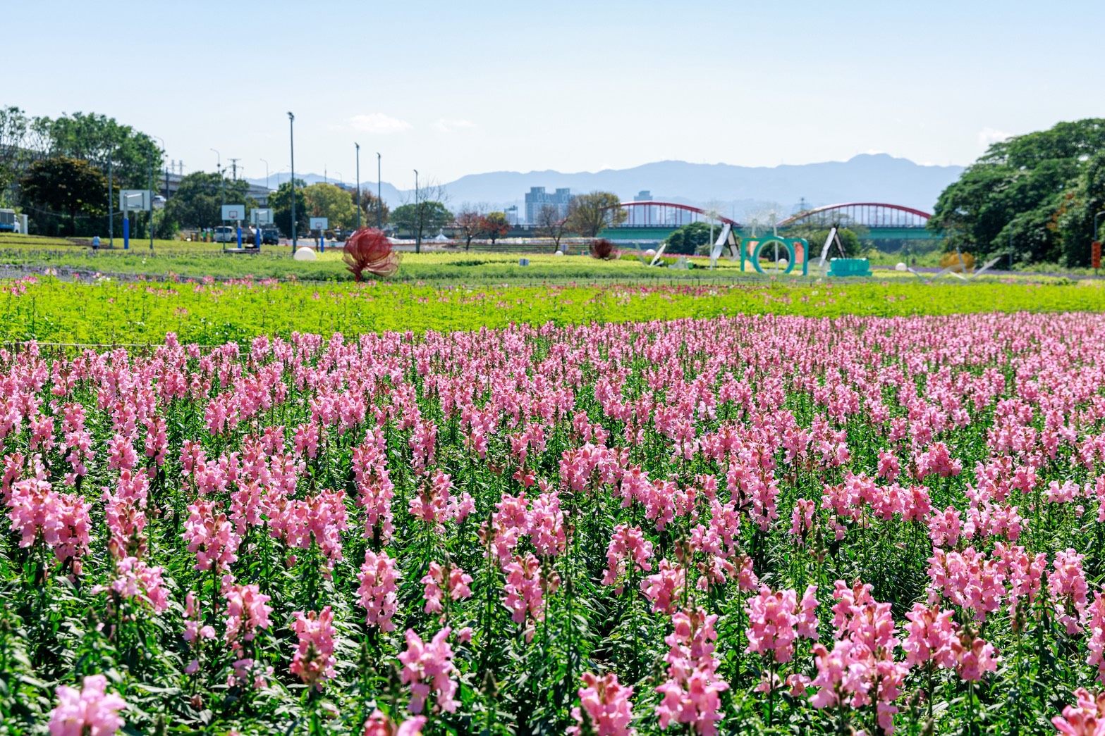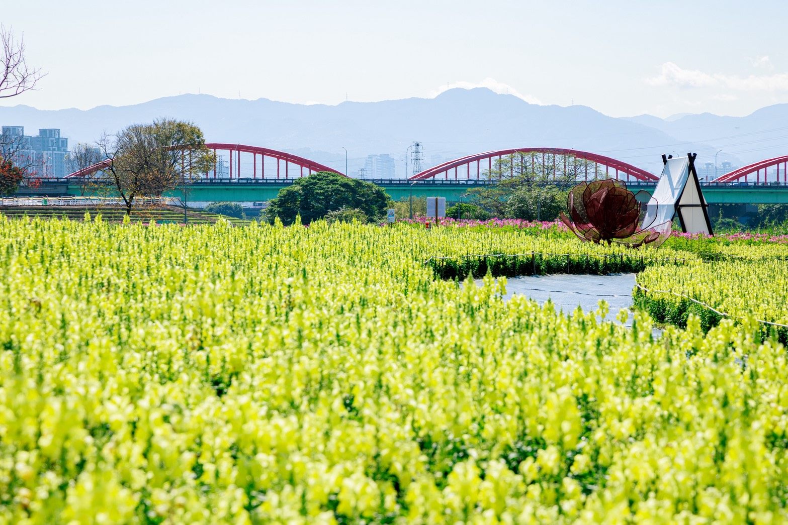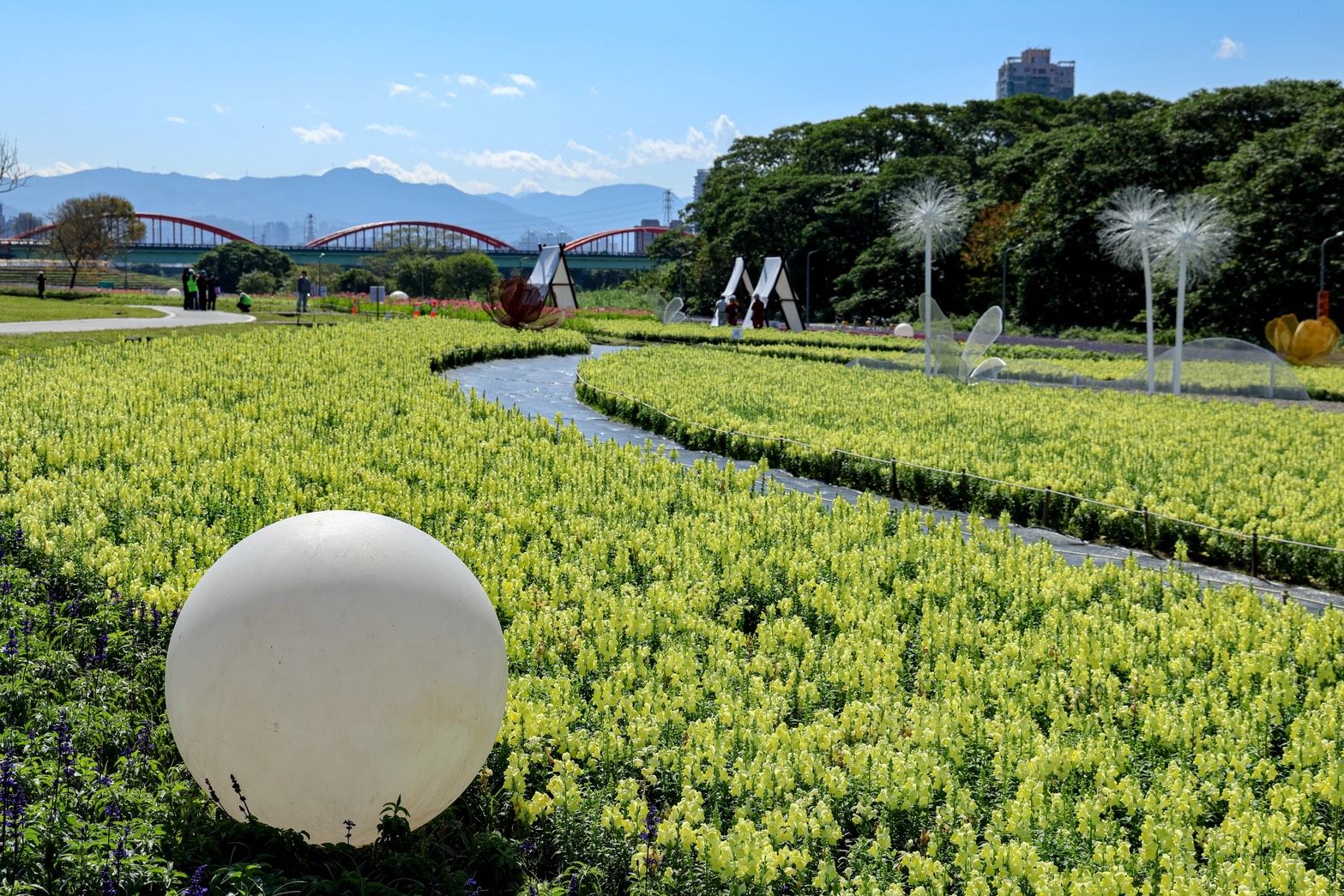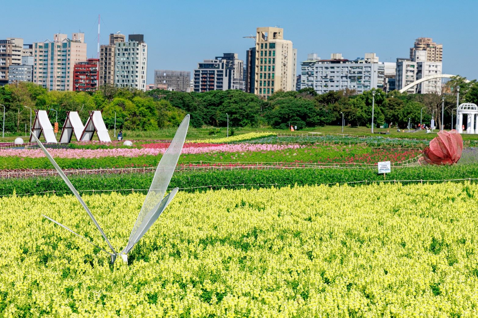 農曆年走春必訪花海景點就在台北市古亭河濱公園。臺北市政府水利工程處今(14)日上午於古亭河濱公園花海裝置景觀區,邀請國內高人氣Cosplayer——Chihiro千尋、Genko玄子、Tsun越尊等,與市長蔣萬安驚喜同框。