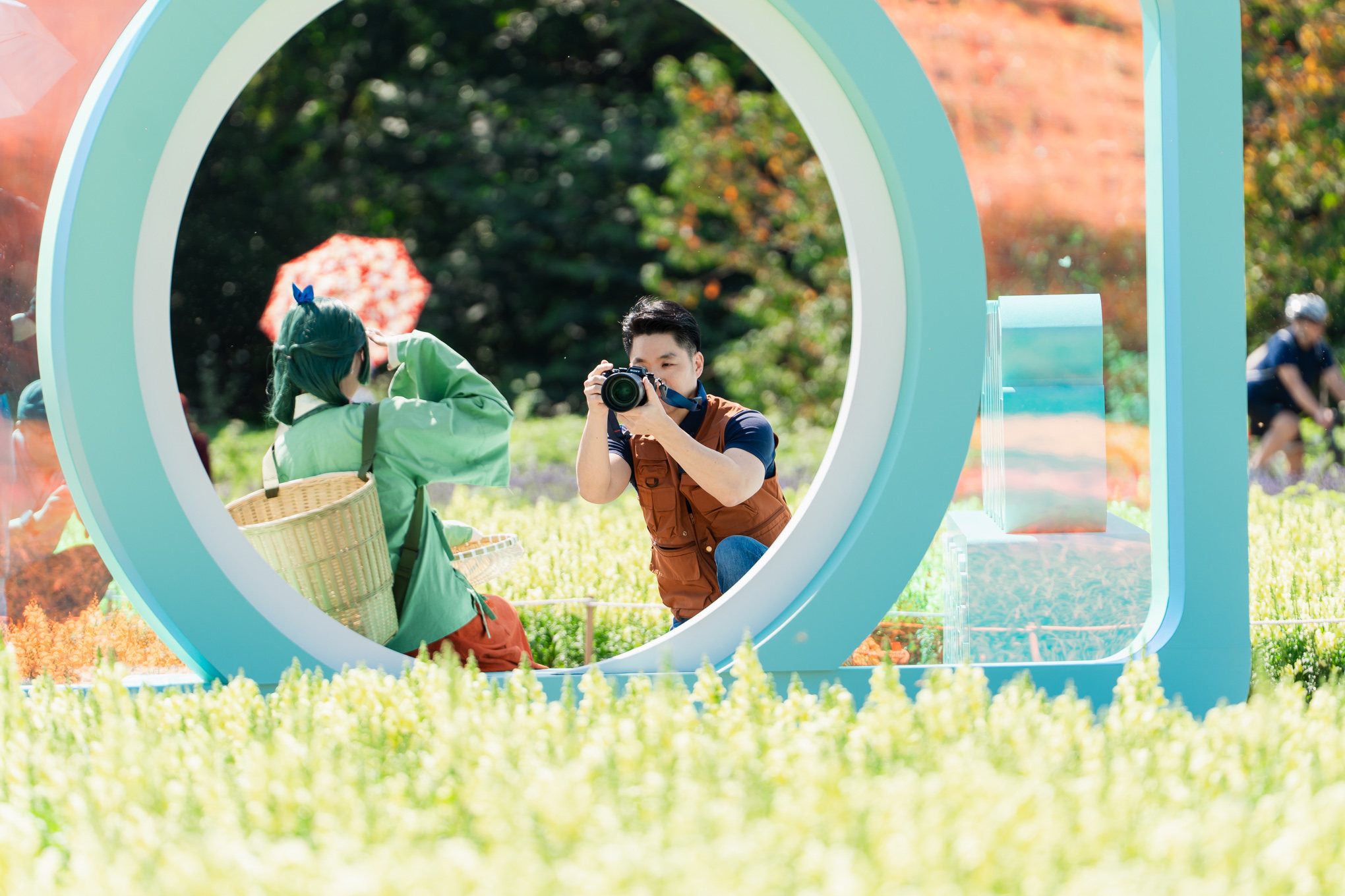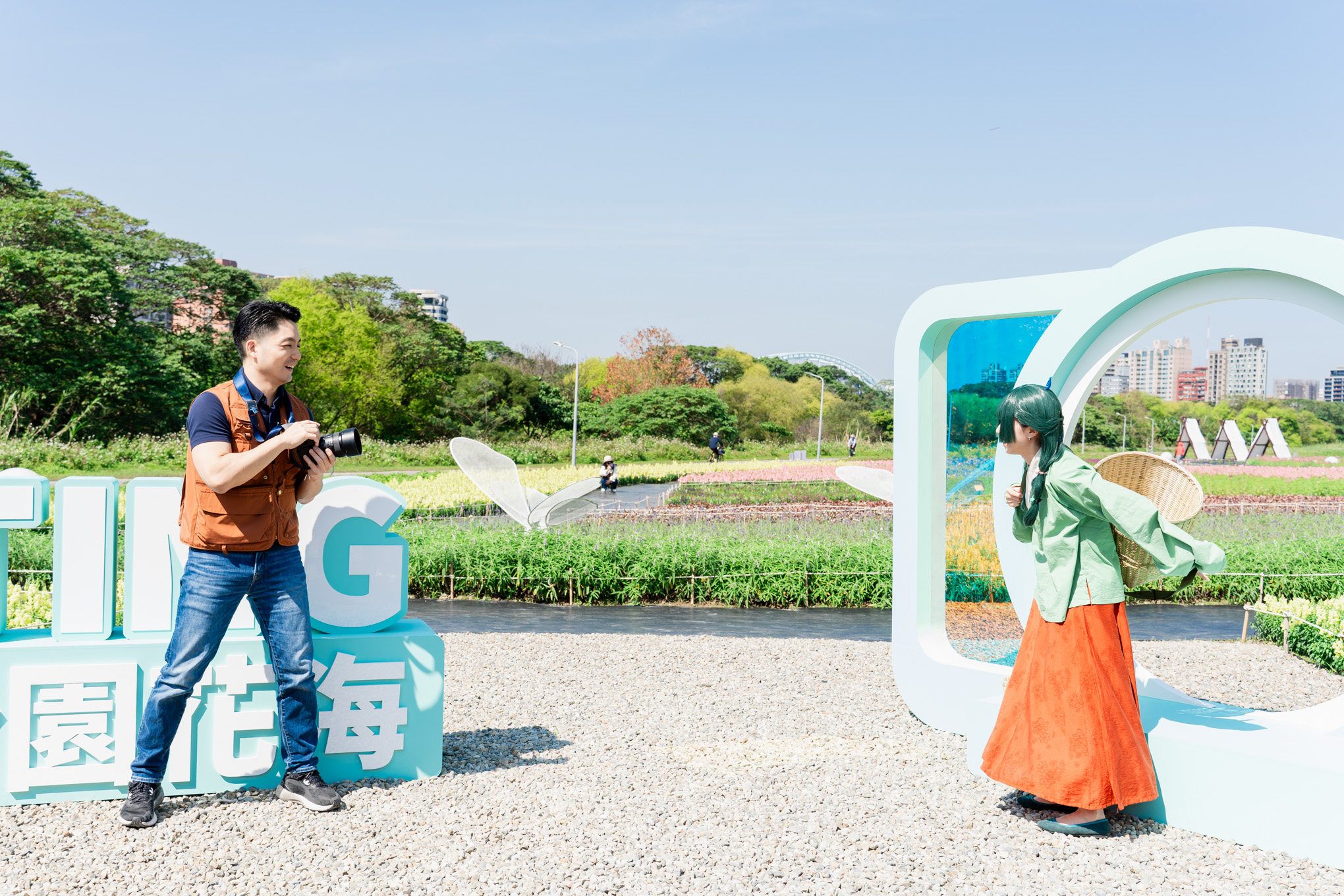 蔣市長更首次挑戰「一日攝影師」角色,在專業攝影師指導下親自掌鏡,為Coser捕捉花海中的最美瞬間,展現有別於以往的「暖男視角」,成功創造跨域話題,市長更在拍攝前與Coser們比出愛心手勢,提前向市民祝賀情人節及新春快樂,畫面溫馨且充滿「跨次元」的浪漫。