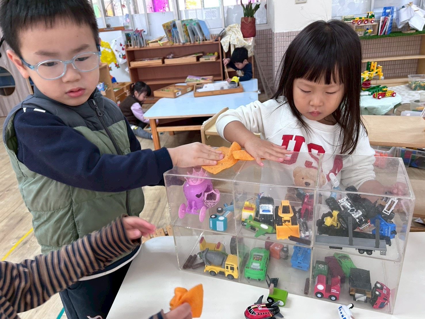 師生一起分工合作,整理學校環境,從擦拭桌椅、整理書櫃、清潔玩具與公共空間等,個個認真投入,展現滿滿的活力與責任感。透過親身參與,孩子們不僅學會整理與分類,更體會到維持整潔環境的不易。