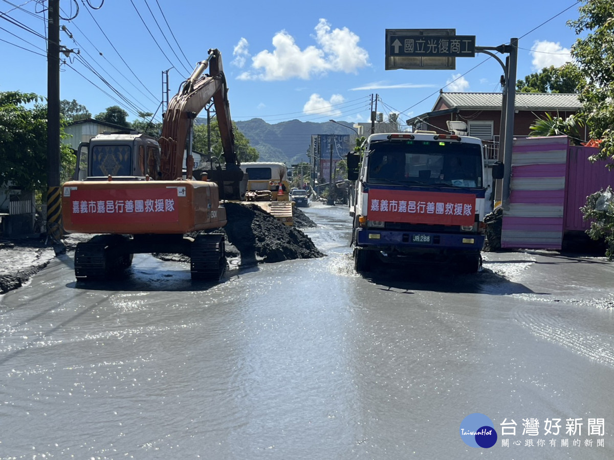 花蓮縣光復鄉傳出災情後,嘉義市嘉邑行善團鄭秀玉與理監事們,第一時間啟動應變措施,集結救援車隊及重型機具,號召百餘名志工分批趕往災區救災,歷經7小時車程,今天上午抵達花蓮光復鄉。行善團總幹事蔡坤章說,首要任務就是先協助清理泥沙、廢棄物,幫助居民進行復原工作。