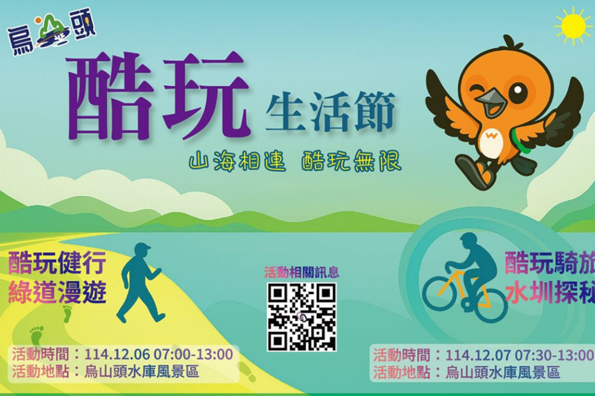 烏山頭水庫酷玩生活節,結合運動休閒×水資源教育×地方觀光推廣,以山海相連,酷玩無限的精神,體驗烏山頭水庫、水圳綠道及山海圳國家綠道之美。12月6日健走活動、12月7日自行車活動,以烏山頭水庫為核心,串聯嘉南大圳與水圳綠道,為民眾打造一場結合運動、教育與旅遊的年度盛會。