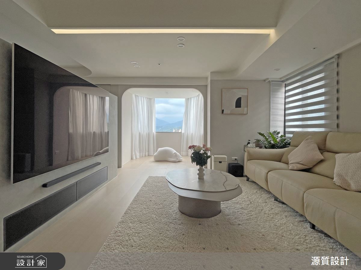 客廳窗邊空間由一道弧形拱門分隔,奶茶色所鋪陳空間,彷彿走慢了時間,有如一個世外桃源,大面窗戶搭佐紗簾,讓空間在隱私與採光間取得平衡,而無擺放傢俱的設計賦予使用彈性,每一幀都是迷人模樣。