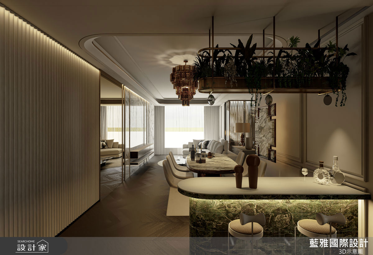 空間基底以柔和奶油白打底,佐以香檳金、咖啡灰與赤陶棕等低飽和色調,完美詮釋出如同晨光灑落巴黎左岸般的靜謐與高雅。設計主軸透過大量的弧形線條與對稱比例,讓優雅秩序自然地流淌於空間之中;在細膩的石紋、霧面金屬與柔軟布質肌理之間,光影溫柔地遊走,使居所成為一場關於「時間與光的對話」,展現柔性而詩意的當代美學平衡。步入公領域,設計師巧妙地運用線性天花導光設計,使光線被柔化,進而模糊了牆面與空間的邊界,創造出曖昧且富有層次的光影氛圍。客餐廳以開放式設計將生活動線自然串聯,讓居者在場域間保有最大尺度的自由;電視主牆選用義大利白灰紋大理石作為視覺焦點,搭配霧面金屬飾框,以一種極度細膩而克制的姿態,展現現代法式的內斂華麗。沙發背牆並非實體隔間,而是以半透明的玻璃格柵取代,虛實交錯間讓空間更具視覺深度與層次。視線轉向餐區,曲線石桌與立體雕塑吊燈的結合,更是為整體場域注入了強而有力的光影重心,在理性與浪漫間找到精準的平衡點,描繪出都會生活的精緻畫面。全案的材質語彙巧妙地運用了冷暖對映,義大利卡拉拉白大理石與深綠蛇紋石形成一場視覺重奏,香檳金、銅色飾條則如微光般,映照出空間的光影溫度,搭配間接燈帶照明與霧面燈罩的低飽和光環,在靜謐張力中,譜寫出屬於當代都會輕奢居所的永恆品味。