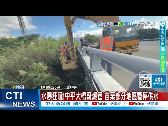 苗栗縣銅鑼鄉中平大橋下方,近日發生一起水管破裂事件,造成大量自來水噴湧而出,情形猶如噴泉。據了解,這條直徑40公分的水管主要供應中平工業區,突如其來的破裂引發了周邊居民的關注與通報。自來水公司表示,已經透過周邊進水場調度水源,並且有4戶居民受到影響。