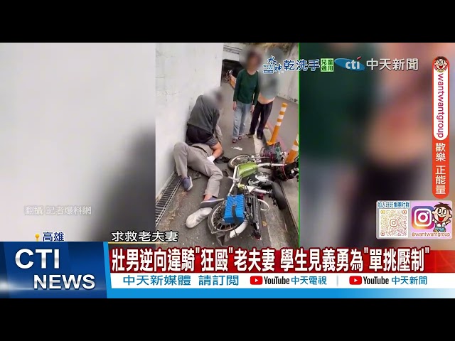 高雄市楠梓區30日下午發生一起街頭暴力事件,一對年長夫婦在行人專用道散步時,遭逆向駛入的機車騎士撞擊後,竟被對方施暴毆打。一名21歲簡姓男大生路過見狀挺身制止,雖遭安全帽攻擊仍成功將施暴者壓制在地,警方到場後將施暴騎士依現行犯逮捕。