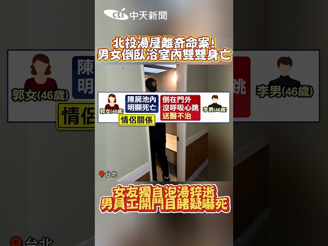 台北市北投一間溫泉旅館8日發生2死悲劇,郭姓女子在湯屋泡湯猝逝,其男友46歲李姓員工疑因撞見女友陳屍浴池,情緒激動加上身體不適倒臥池外,送醫後均宣告不治。據悉,兩人交往20多年,育有一名20歲兒子,如今卻天人永隔。