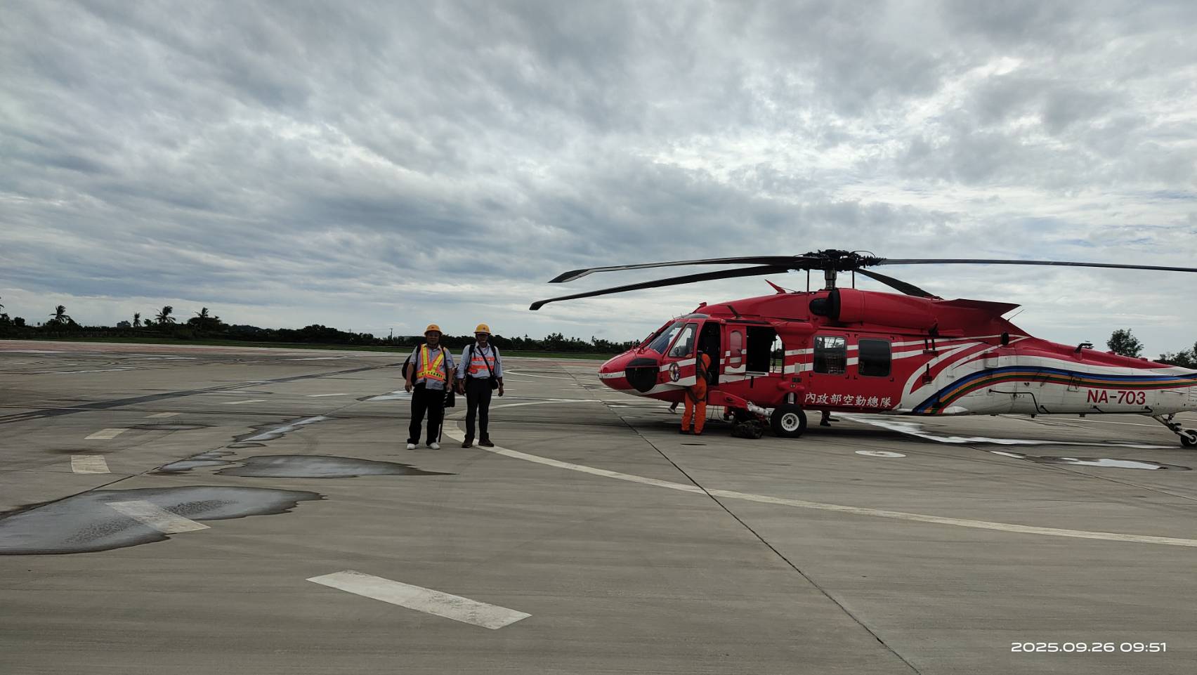 今(26)日上午8時,台東縣政府消防局派遣直升機,載運台電台東區處兩位同仁前往利稻。從空中可見南迴公路沿途道路坍塌受損嚴重,台電電桿多處遭土石沖毀。人員於10時50分抵達利稻村後,立即進行線路巡查,以了解電力受損情形並研擬復電方案。