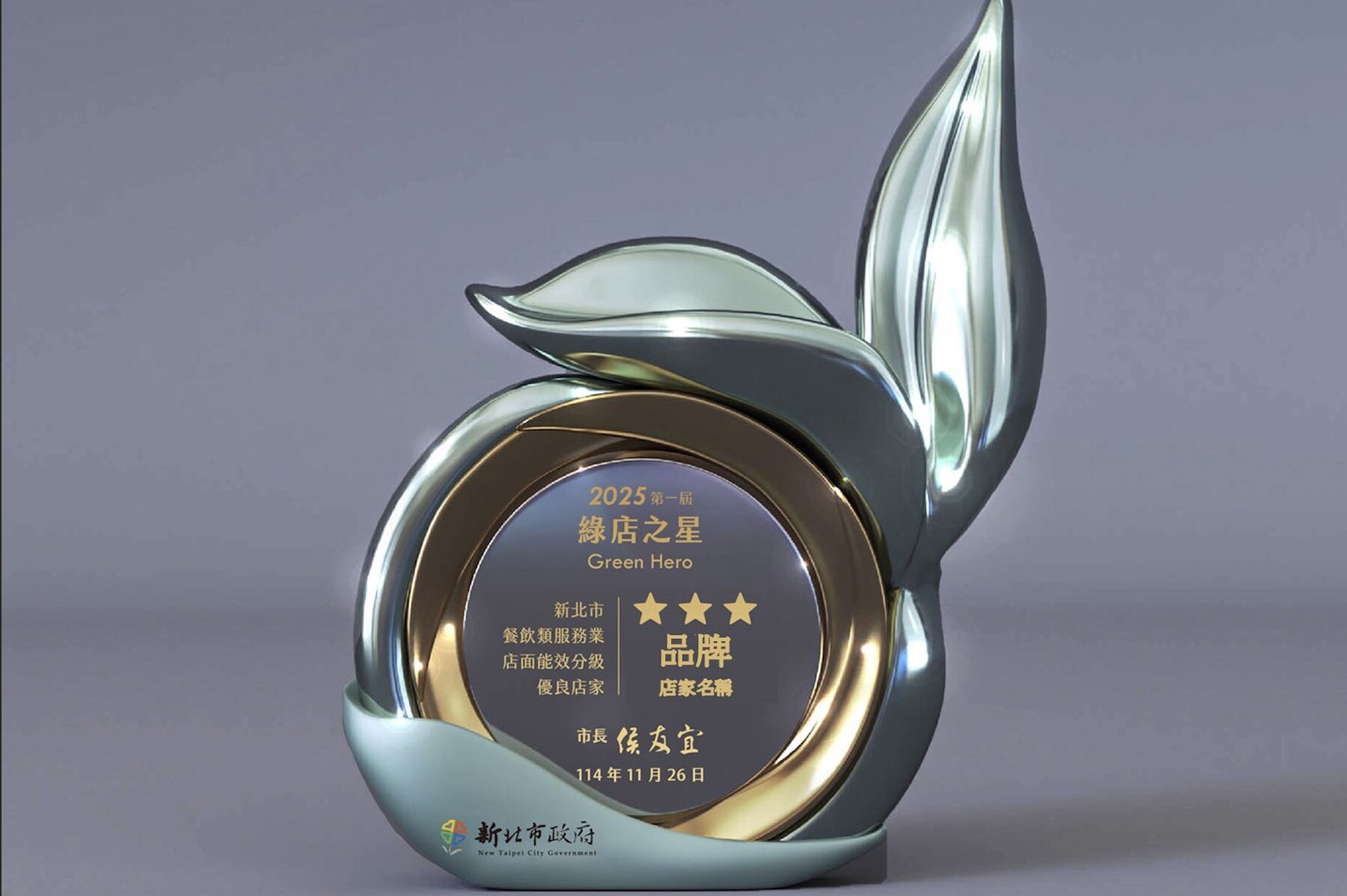 經發局補充,本屆頒獎典禮特別邀請知名藝術家陳凱森打造專屬獎座,以「螺旋生長的葉形環繞」為設計主題,整體造型流線優雅,象徵柔和、共生與持續成長的意象,傳達各品牌在永續發展下的共榮精神,讓獲獎店家在榮耀之中展現綠色承諾。更多資訊歡迎持續關注來趣新北金發局粉專。