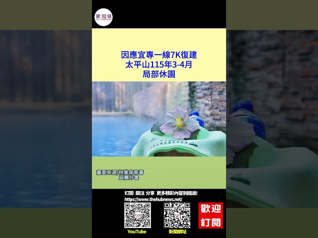 宜蘭分署表示,宜專一線7K處是位於太平山入口售票站及鳩之澤溫泉區過後的路段,因明年進行路基復建工程,預估工期約一年,前期的3月3日至4月30日因崩塌路段必需施作鋼軌微型樁,大型機具長駐現地,考量施工安全的周轉空間與時間,所以太平山園區將局部休園;而中間、白嶺、見晴、太平山莊、蹦蹦車、翠峰湖等據點及其周邊步道,都暫時封閉。太平山相關訊息可上官方相關網站查詢,將持續更新最新資訊。
