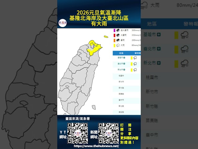 今天2026年元旦,強烈大陸冷氣團南下,北部氣溫逐漸下降,晚間起其他地區氣溫也會下降,氣象署上午發出大雨特報,因東北季風影響,新北市北海岸已有豪雨發生,基隆北海岸及大臺北山區有局部大雨發生的機率,請注意瞬間大雨,山區慎防坍方及落石。