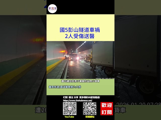 國道5號南向10.4公里彭山隧道內,20日上午7時6分許發生車禍事故,國道警察第九大隊初步調查,48歲羅姓男子駕駛自用小貨車故障於外側車道,遭26歲呂姓男子駕駛的自用小貨車由外側車道撞擊到內側車道而肇事,現場占用內側車道及部分車體占用外側車道,2名傷者被送往萬芳醫院,雙方駕駛酒測值均為0,事故現場於8時32分排除,恢復通車。