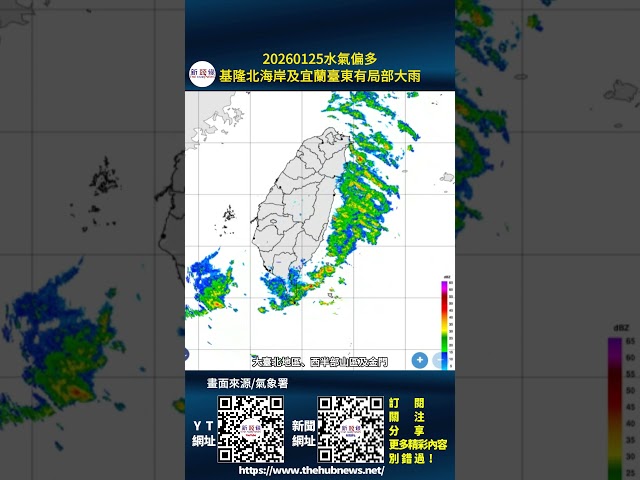 今天1月25日臺灣東半部地區、基隆北海岸、大臺北山區及恆春半島有局部短暫雨,基隆北海岸、東半部地區及恆春半島並有局部大雨發生的機率,大臺北地區、西半部山區及金門、馬祖有零星短暫雨,其他地區及澎湖為多雲;大雨特報資料顯示,因水氣偏多,基隆北海岸及宜蘭、臺東地區有局部大雨發生的機率,請注意。