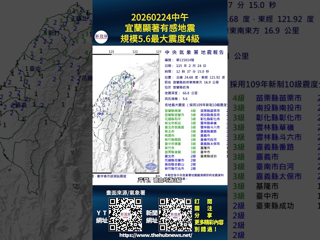 今天2月24日中午12時37分15秒,宜蘭縣政府東南東方16.9公里近海發生芮氏規模5.6的顯著有感地震,地震深度66.8公里,最大震度4級。