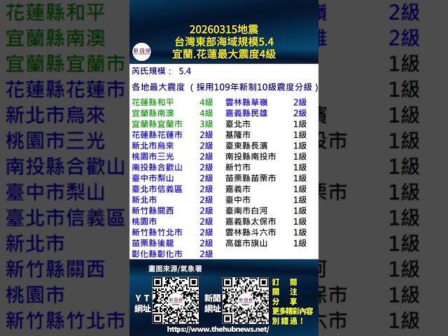 影音/0315台灣東部海域規模5.4地震 宜蘭及花蓮最大震度4級