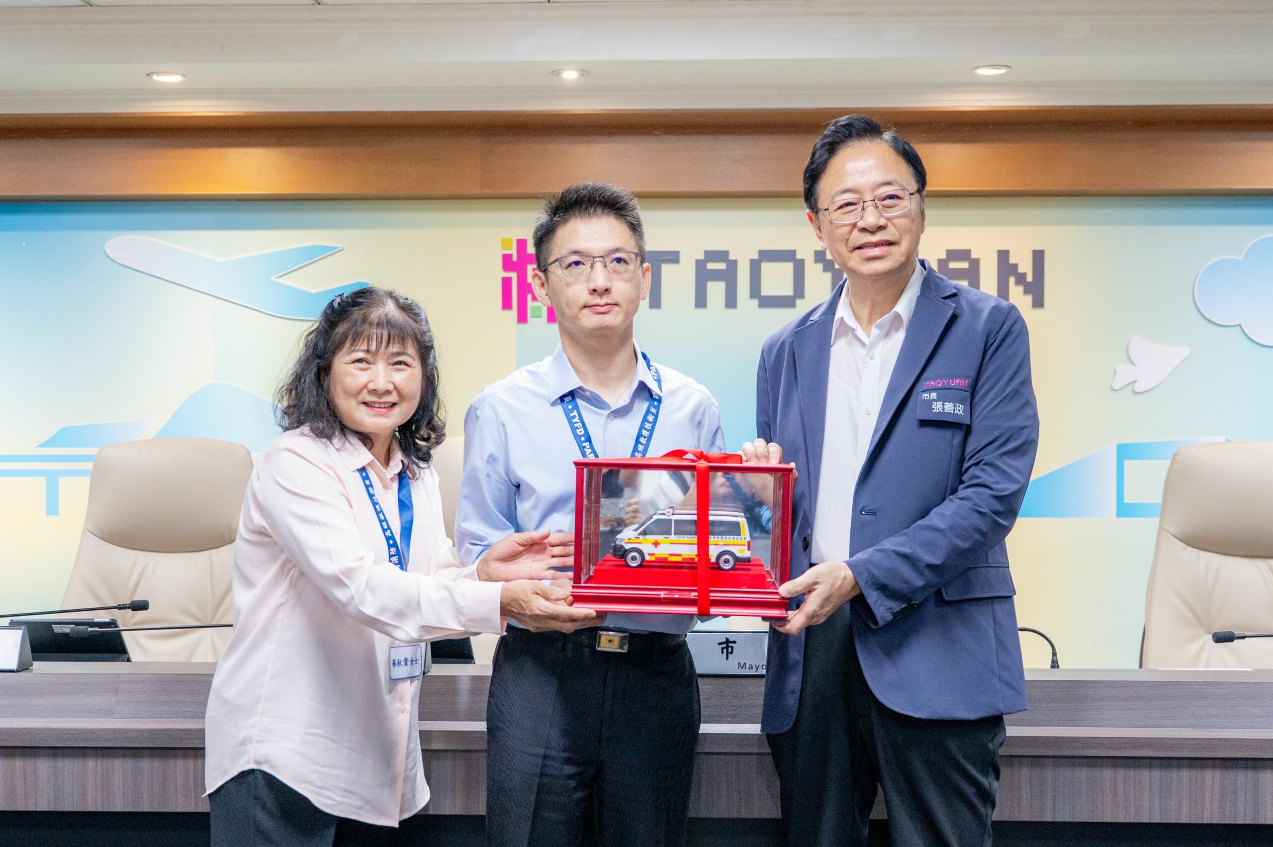 桃園市長張善政今(2)日上午主持市政會議,頒發「蔡秋貴女士及祐通星際有限公司捐贈救護車」感謝狀。張善政表示,感謝蔡秋貴及祐通星際有限公司的善心,聯合捐贈價值320萬元救護車,該輛救護車將配發至中壢區第二救災救護大隊龍岡分隊,有效強化中壢地區的緊急醫療應變能力,為市民生命安全再添一道保障。