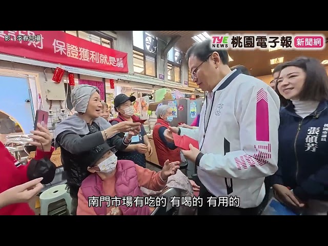 桃園市長張善政今(10)日上午前往南門市場,視察市場重新開張情形。適逢農曆春節前夕,現場採買年貨人潮踴躍,張善政沿街發送福袋,逐一向攤商及民眾拜早年,氣氛熱絡溫馨。