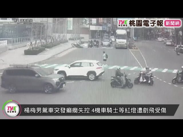 桃園市楊梅區中山路23日下午16時19分發生一起嚴重的交通意外。一名31歲鄒姓男子駕車行經中山路123號前,疑似因癲癇突然發作導致意識模糊,整輛車完全失控,直接衝撞前方正在停等紅燈的4輛機車,巨大衝擊力造成4名騎士當場倒地受傷。楊梅警分局獲報趕抵後,確認雙方均無酒駕,詳細肇因仍待釐清。