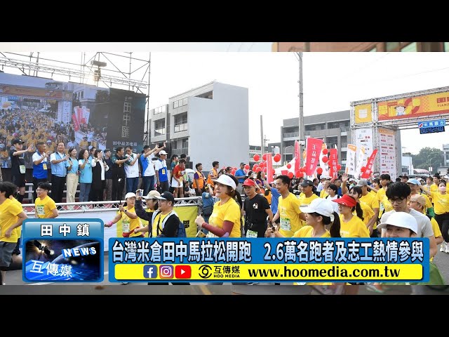 【互傳媒/記者 林明佑/彰化 報導】2025彰化縣馬拉松嘉年華第三場賽事──台灣米倉田中馬拉松,今(9)日上午在田中鎮公所前熱鬧開跑!本屆共有約1萬7,000名跑者及9000位志工鄉親熱情參與,現場人潮洶湧、熱力四射,充分展現彰化熱情的人情味。縣長王惠美與中華民國舒康樂活運動協會榮譽理事長張鴻均、台灣米倉田中馬拉松總幹事鄭宗政、鎮長蕭淑芬及立委、議員各級民代共同為賽事鳴槍起跑,揭開序幕,彰化田中子弟藝人任賢齊返鄉參與,還有藝人姚元浩、九孔等人,現場氣氛熱烈、加油聲不斷。