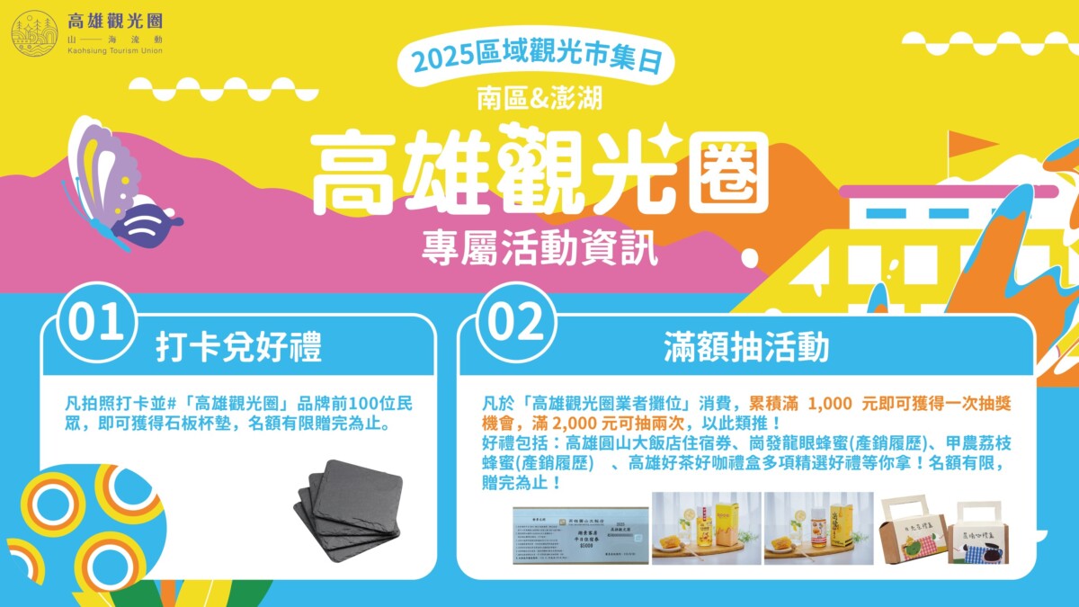 茂管處更推出多項限時好康,包括打卡送好禮、消費滿額抽住宿券,以及「買500送100」的早鳥優惠券(限高雄觀光圈攤位使用),吸引民眾邊逛邊享優惠。