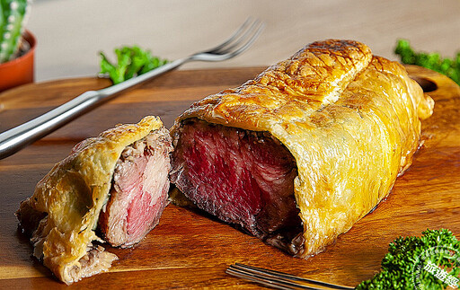 威靈頓牛排因饕客強烈敲碗回歸,酥皮包裹粉嫩牛排,一刀切開香氣四溢,是節慶餐桌上最具儀式感的經典菜色。台北凱撒大飯店提供