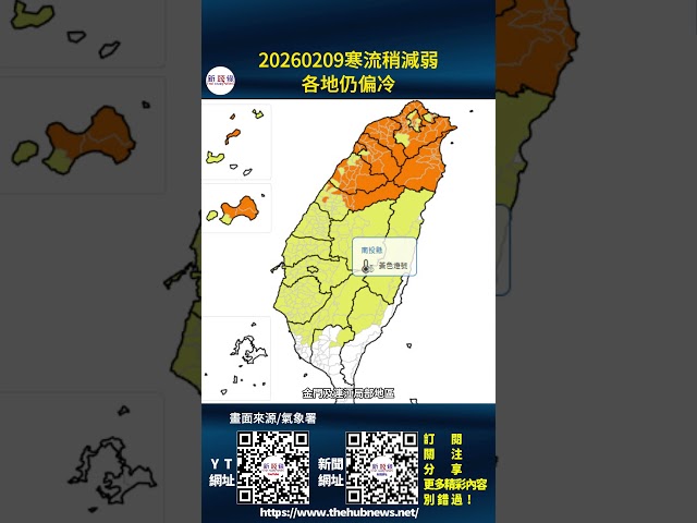 今天2月9日清晨受寒流影響,各地天氣非常寒冷,白天起寒流雖然稍會減弱,但各地感受仍然偏冷;氣象署發出低溫特報,今晨至上午非常寒冷的地區有:基隆、新北、臺北、桃園、新竹縣市、苗栗、臺中、宜蘭、金門及連江局部地區有持續10度左右或以下低溫的機率;寒冷地區為:彰化、南投、雲林、嘉義縣市、臺南、高雄、屏東、花蓮和臺東,有出現10度以下氣溫的機率。請注意保暖,農作物及水產養殖業慎防寒害。